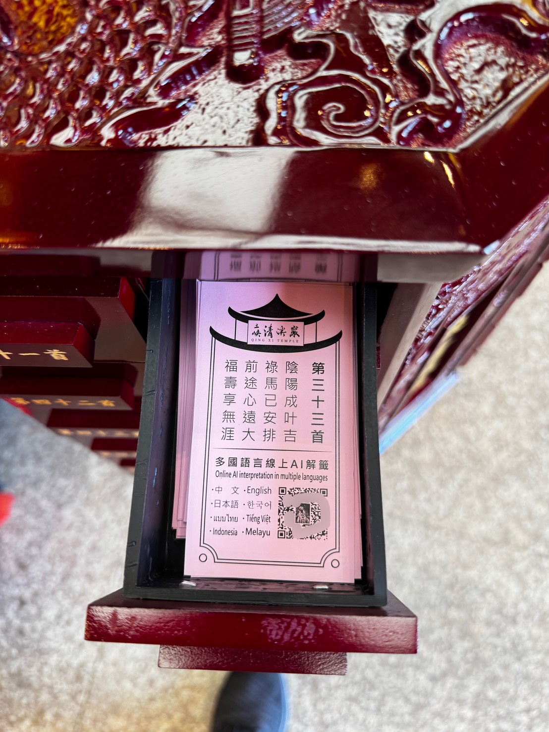 在劉賢益會長的遠見與推動下,清溪巖正式啟用【AI線上解籤系統】,並特別導入八國語言線上解籤功能,讓信眾們,新住民與國際觀光客都能輕鬆體驗清水祖師靈籤的智慧與慈悲。